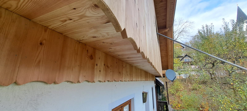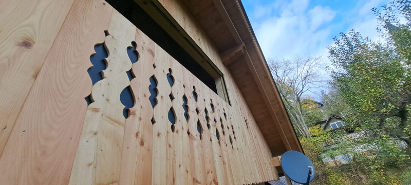 Die Konstruktion besteht aus Brettschichtholz und KVH (Konstruktionsvollholz), die Außenschalung wurde in Lärche mit geschweiften Abschlüssen und Ziermustern in den Giebelwänden ausgeführt.
