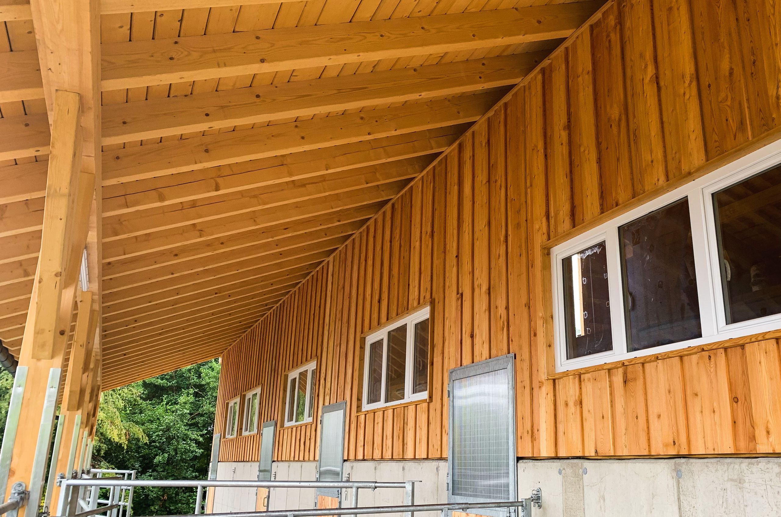 Auf den Stahlbetonwänden wurde eine Brettstapeldecke aufgestetz, Holzriegelwände mit Lärchenschalung montiert,