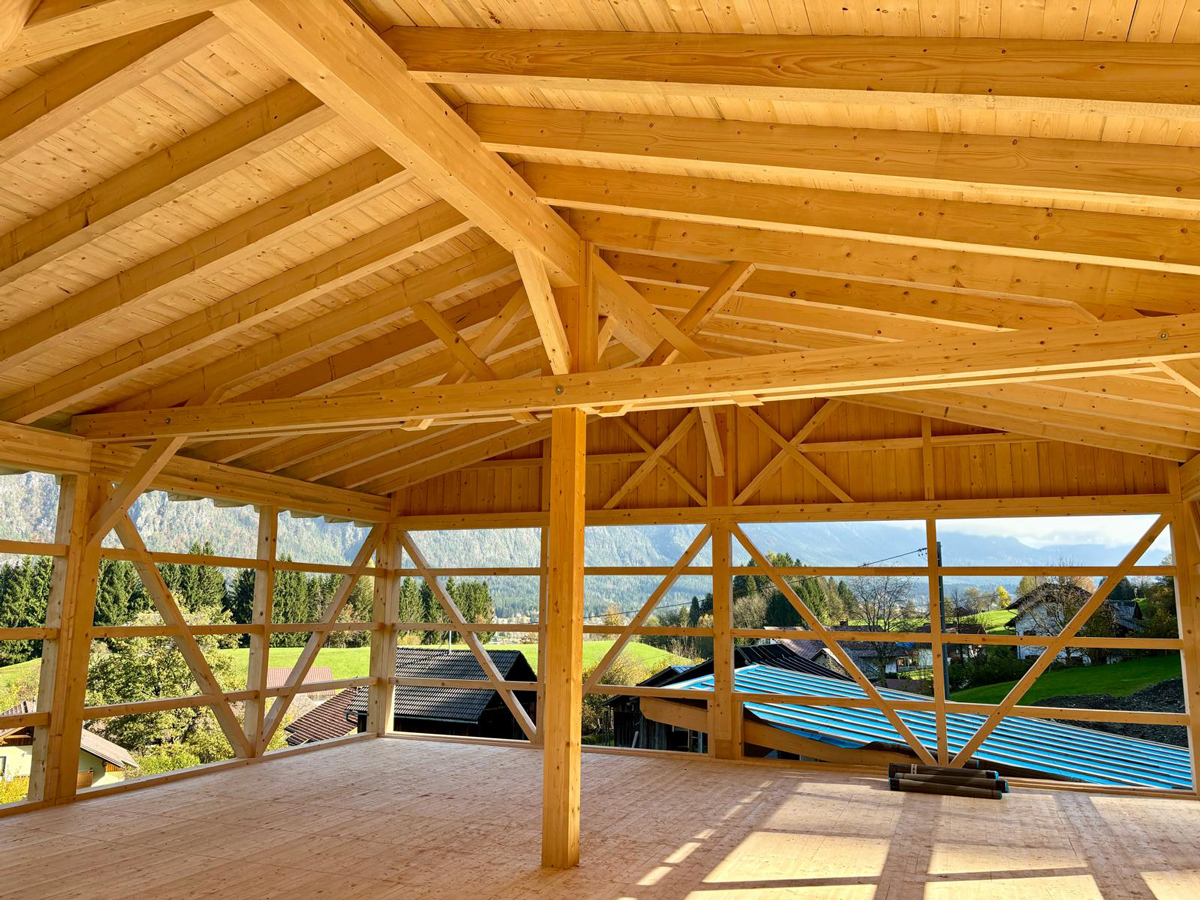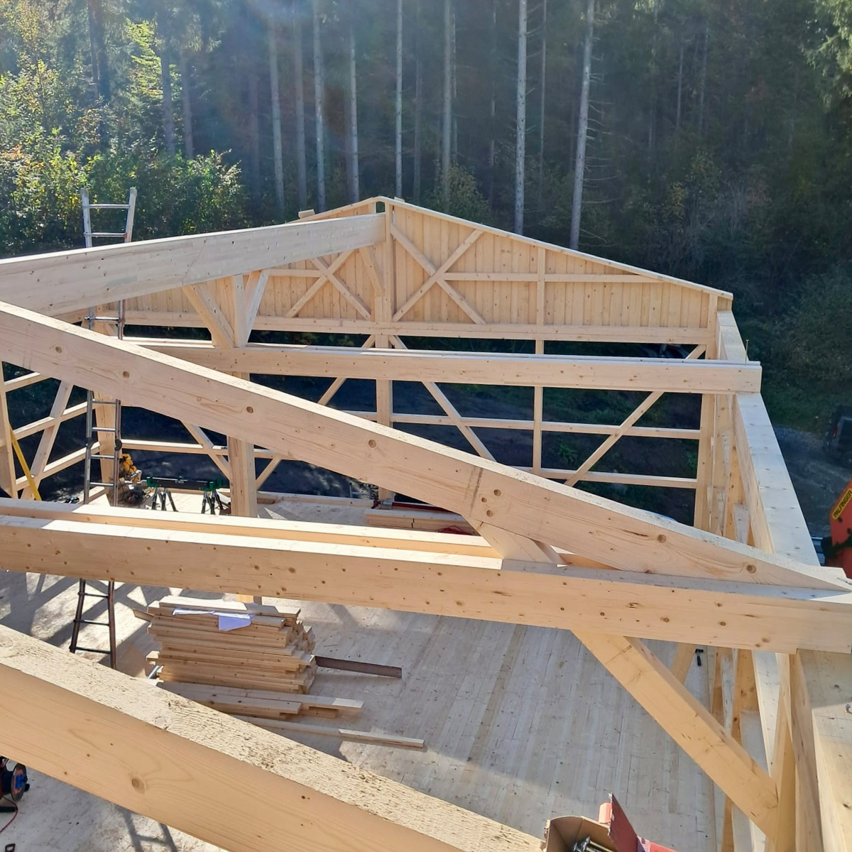 Die Konstruktion besteht aus Holzriegelwänden, einer Tramdecke aus Brettschichtholz sowie Sparren aus massivem Bauholz.